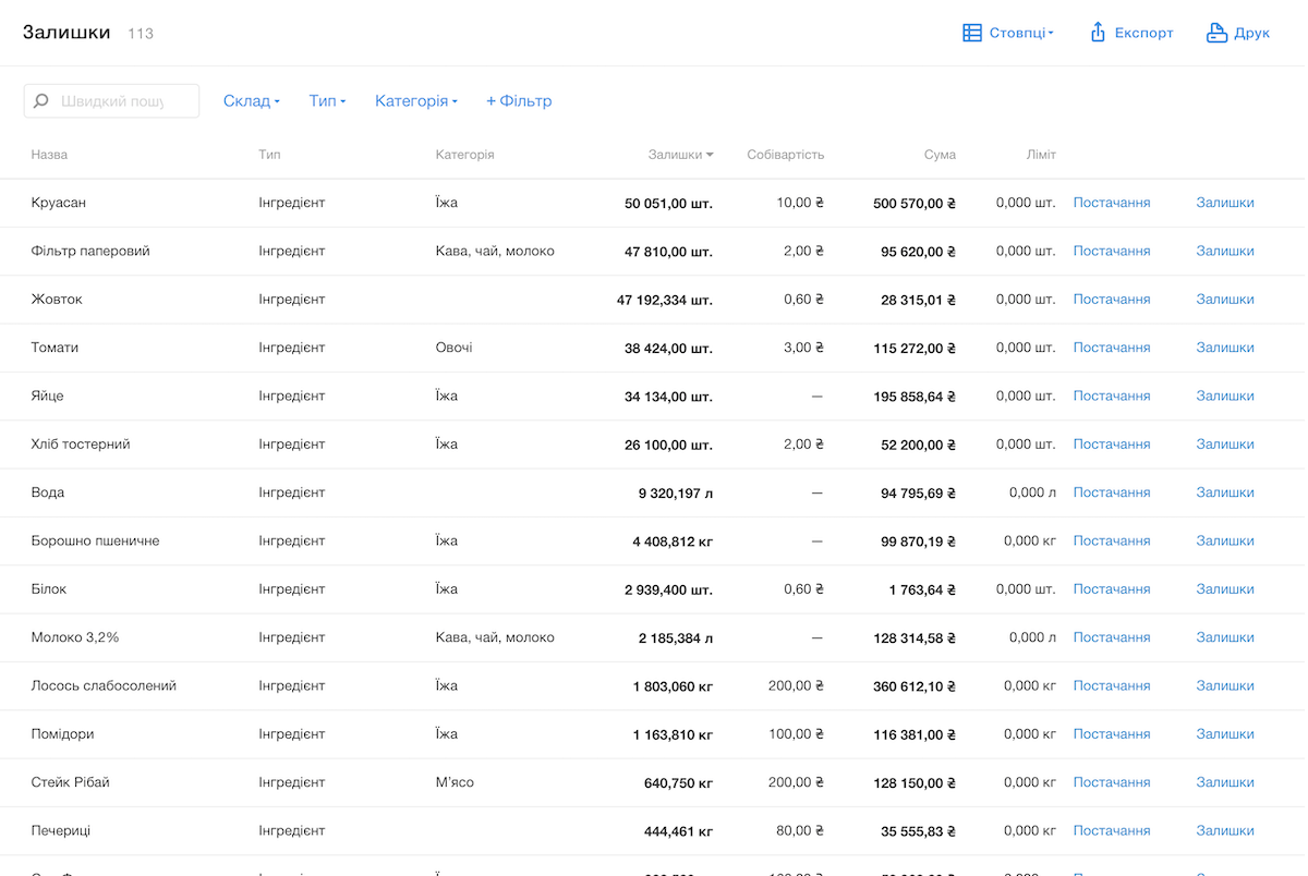Щоб керувати рухом інгредієнтів та товарів на складі, важливо вести облік залишків . Встановіть ліміти залишків, щоб вчасно робити закупівлі. Також це дозволить контролювати рух інгредієнтів й допоможе в проведенні інвентаризації.