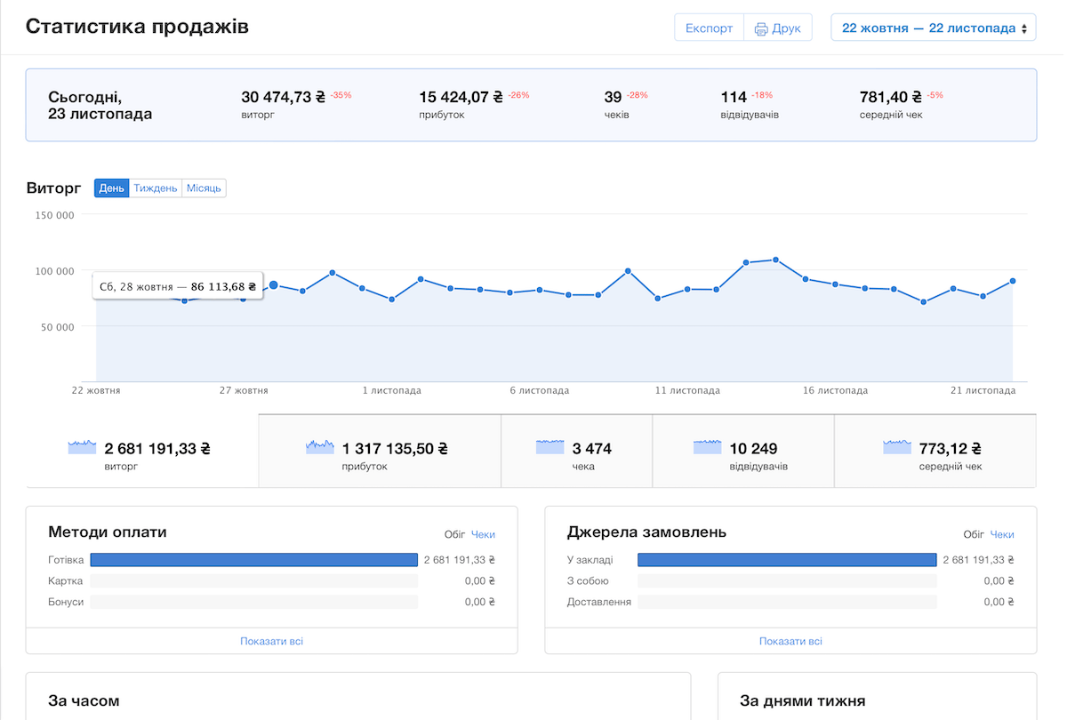 Коли ви розпочнете перші продажі в кафе, зможете контролювати аналітику продажів за різними періодами часу, аналізувати продажі за дні, години або місяці, а також відстежувати ефективність офіціантів, категорій страв і чеків.