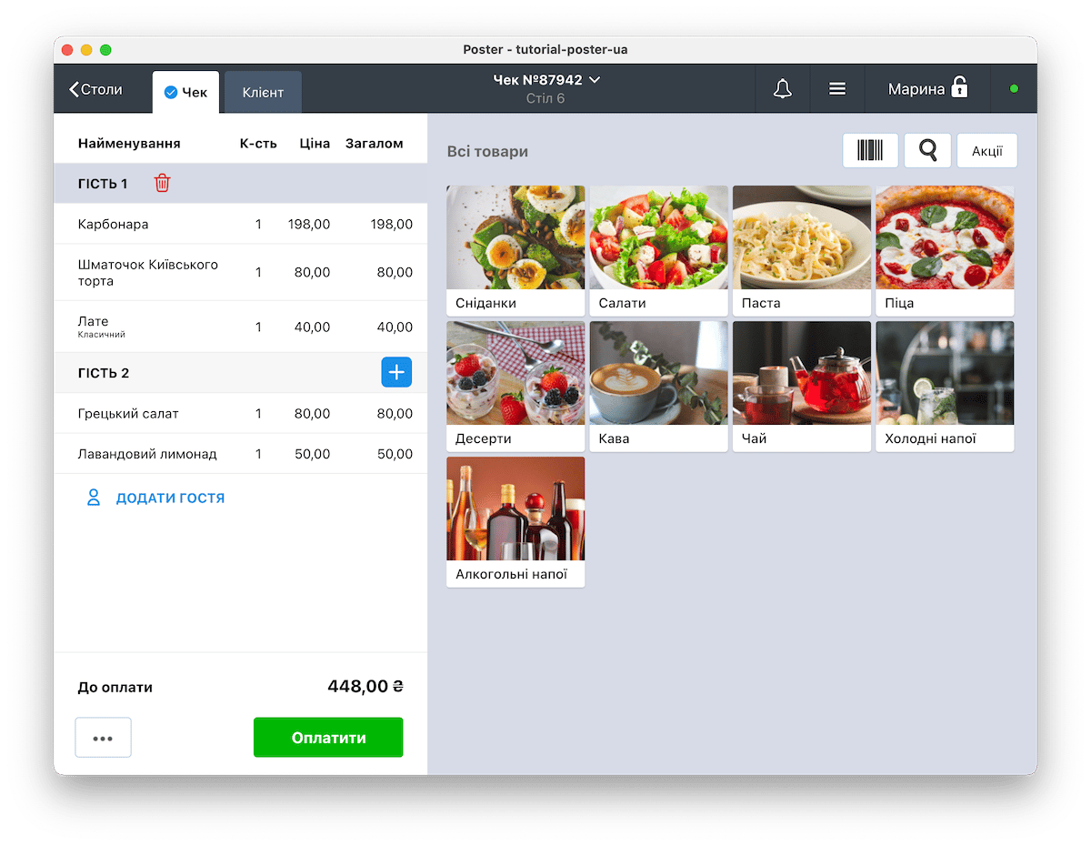 Зручний інтерфейс каси продажів прискорить обробку замовлень, а мобільна каса дозволить офіціантам приймати замовлення всього у кілька кліків. Організуйте ваші страви у категоріях, додайте зображення, так ваші працівники легше орієнтуватимуться у меню.