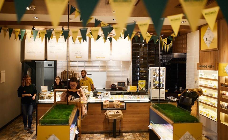 «МОМО» — це мережа кафе в Києві. Затишний інтер’єр розділений на дві головні зони: вітрини з їжею та столики. Стіни у світлих тонах, світлі дерев’яні столики. Яскравими «плямами» в ресторані є жовті сидіння крісел і подушки, зелені рослини в підлогових горщиках.