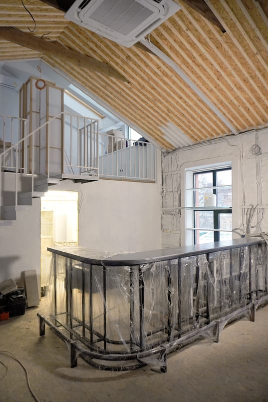 Ми йдемо по своїх же слідах, бо новий бар знаходиться на Терещенківській, 17b, як і Squat 17b. Так сталось, що в цьому будинку є другий поверх, який знаходиться в приватній власності. Я весь час ходила навколо нього і кілька років вмовляла здати мені це приміщення в оренду, щоб створити новий проєкт. І в жовтні 2023 року власник нарешті погодився. Саме тоді почалось велике будівництво — так називається наш перший робочий чат в Telegram зі всіма дотичними до бару. Це дуже світле двоярусне приміщення. Другий ярус знаходиться під стріхою з мансардними вікнами. Під стелею розмістили світлові інсталяції: великі світильники, які розробляли для іншого закладу наші друзі. Заклад закрився (For Friends — прим.редактора), а світильники лишились, і я забрала їх в «Люмен». Хотілось саме їх, бо вони дають унікальну можливість гратися зі світлом, м’яко міняти атмосферу і простір.