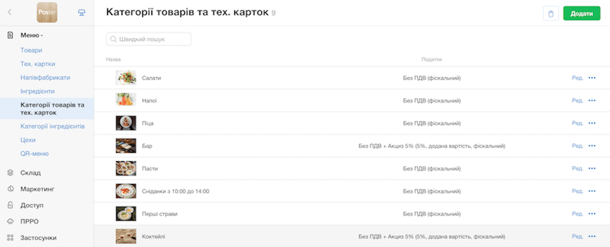 Додайте самі товари та тех. картки. Зробіть гарні фото до страв, щоб на касі офіціантам буде легше орієнтуватись в меню. Вкажіть складники страви, вагу та вартість.