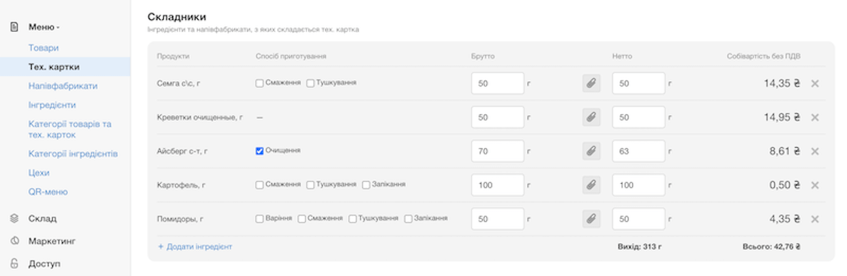 Щоб створити меню в системі обліку, знадобиться витратити не багато часу. На першому етапі внесіть всі інгредієнти, які входять до складу страв. Це корисно, щоб при подальшому наповненні меню одразу розрахувати вірну вагу страв та її собівартість.