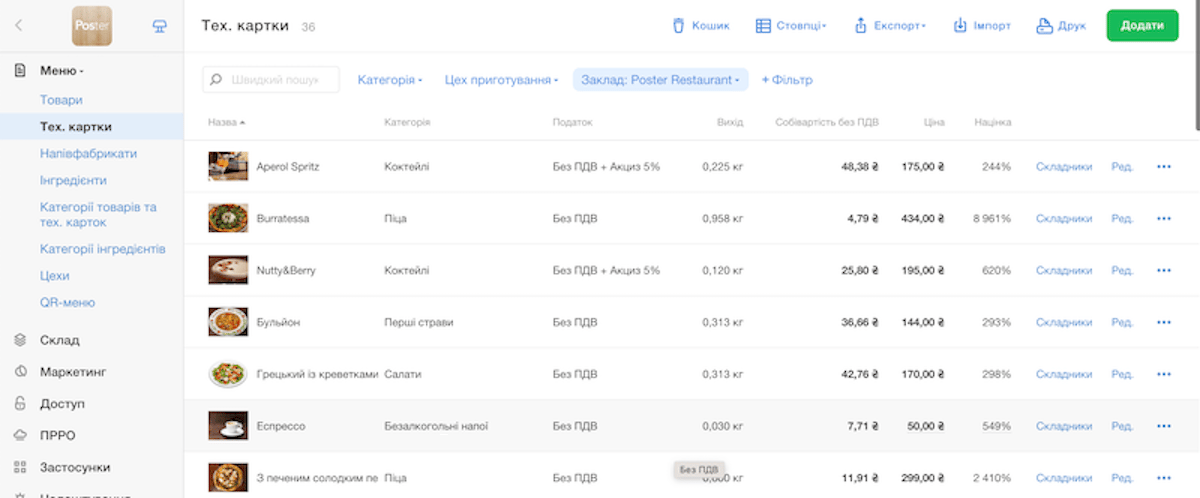 Програма допоможе автоматично прорахувати собівартість товарів та тех. карток. Для цього просто додайте постачання для інгредієнтів, що входять до складу позицій.