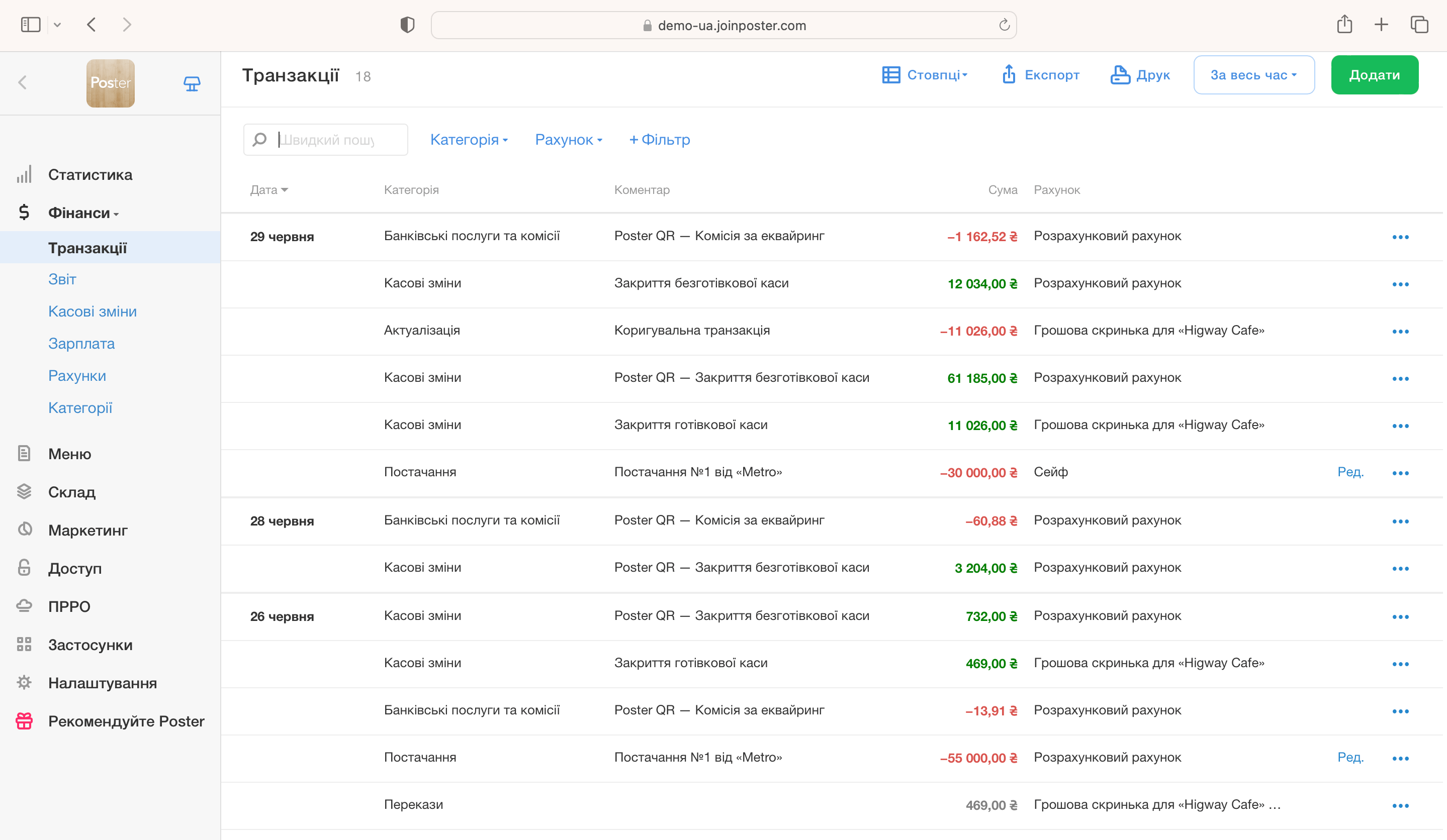 Фінансовий облік та підрахунок фінансового результату роботи — додавайте видаткові та прибуткові транзакції, які проходять за рахунками у вашому закладі. Так ви зможете подивитися фінансовий результат наприкінці кварталу чи місяця та оцінити роботу закладу.
