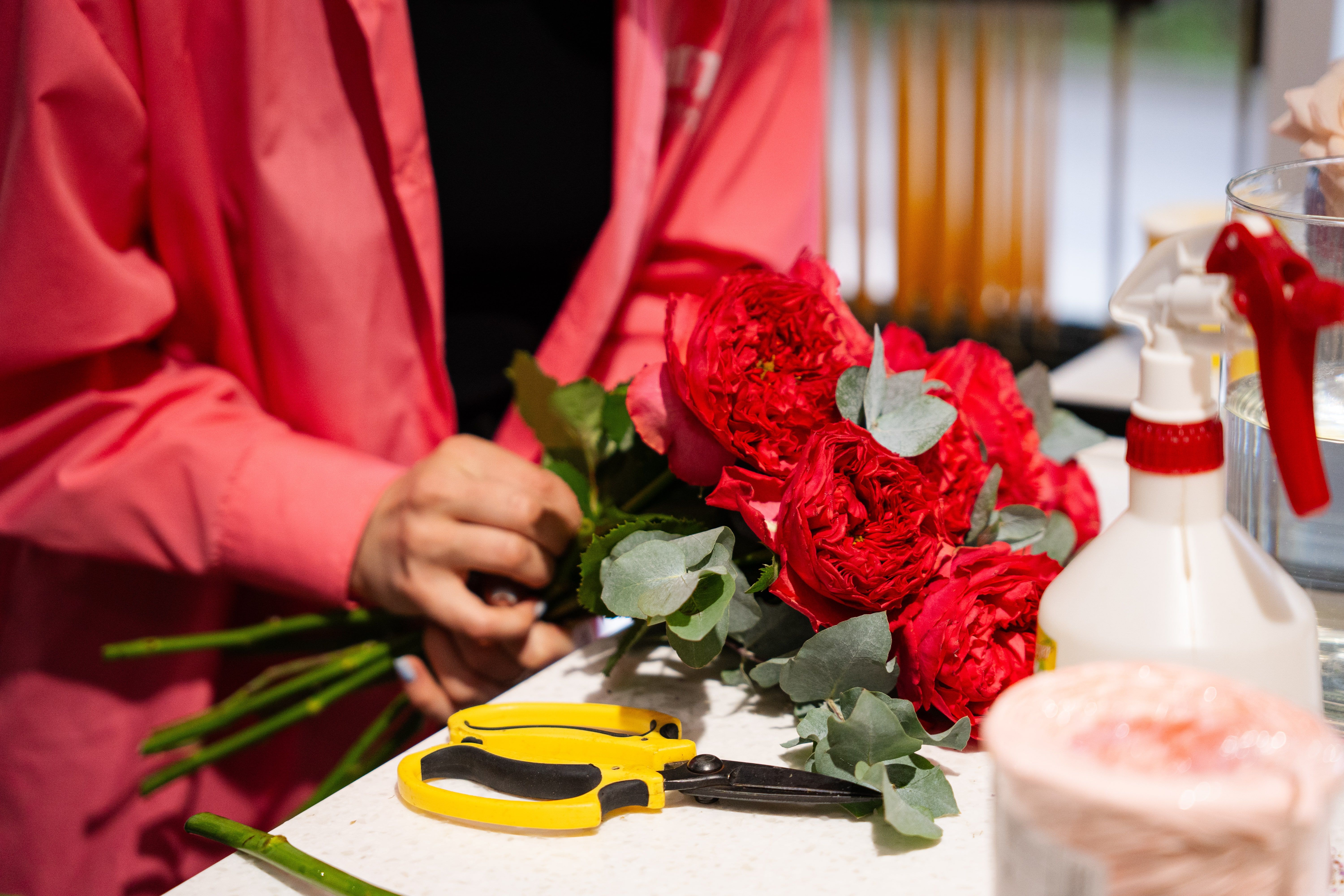 У деяких квіткових флористи працюють за низьким столами – це не зручно, бо треба стояти весь день так над квітами. Тому я раджу для відкриття флористичного бізнесу придбати стіл висотою від одного метра.
