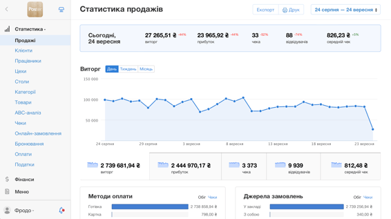 у розрізі за чеками, категоріями товарів та співробітниками. Переглядайте статистику по годинах, по днях тижня та порівнюйте з іншими звітними періодами, щоб розуміти, як йдуть справи у вашому закладі.