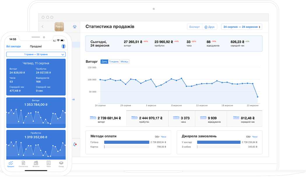 Ви дізнаєтеся, які позиції продаються частіше і який заклад приносить більше прибутку, хто з працівників ефективніший та які способи оплати обирають клієнти.