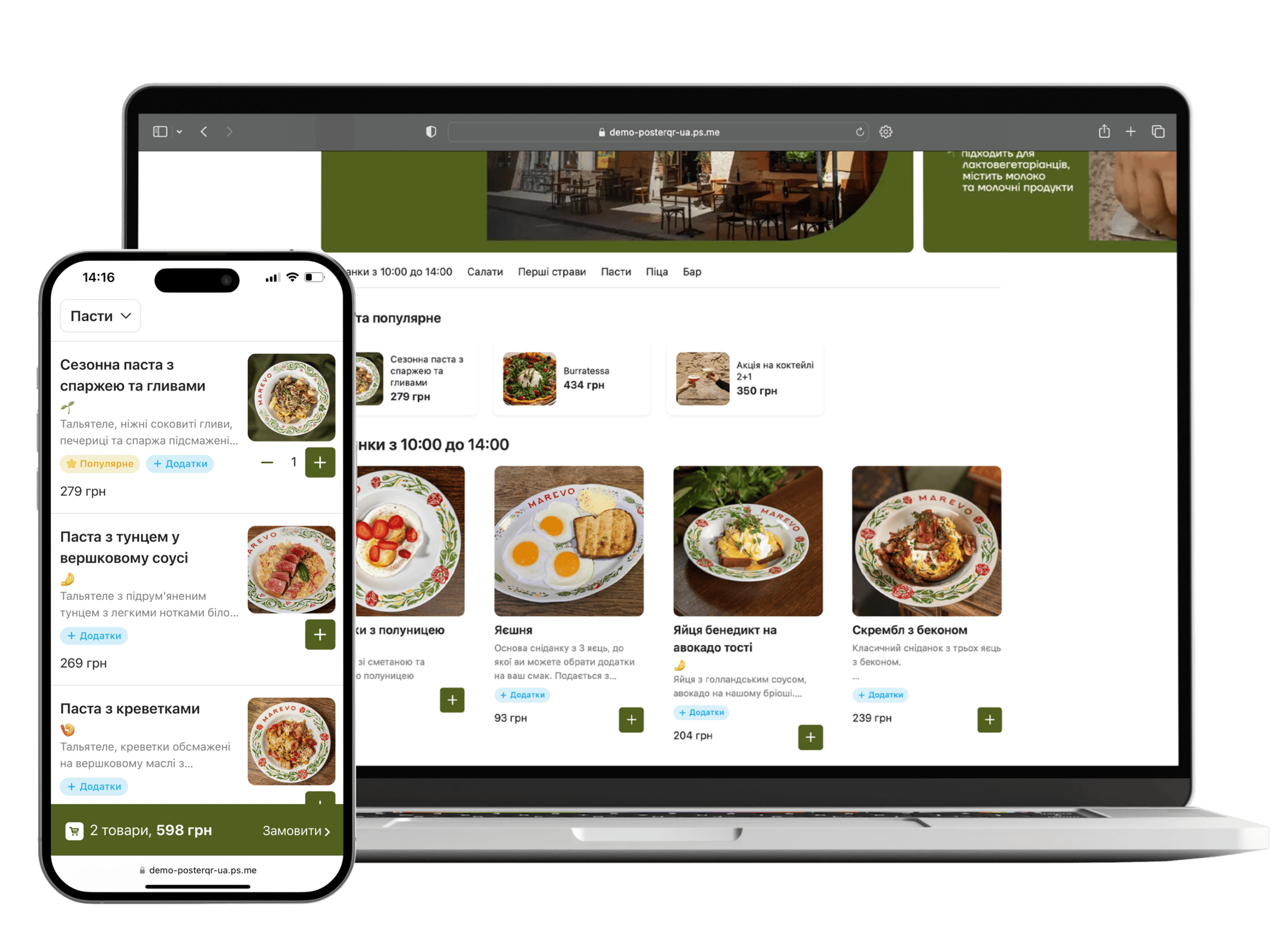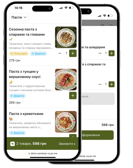 Покажіть спецпропозиції та акції, виділіть найпопулярніші товари — все в зручному конструкторі сайту ресторану.