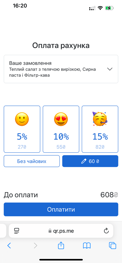 Оплата чайових за QR-кодом дає можливість збільшити чайові до 30%, до того ж вони зараховуються безпосередньо на карту офіціантів.