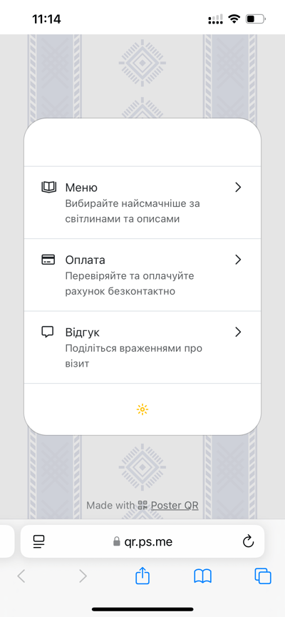 QR-меню — це більше, ніж перелік страв та напоїв. Це перше враження про ваш бренд. З Poster QR воно виглядає стильно, лаконічно й створюється автоматично на основі вашого меню.