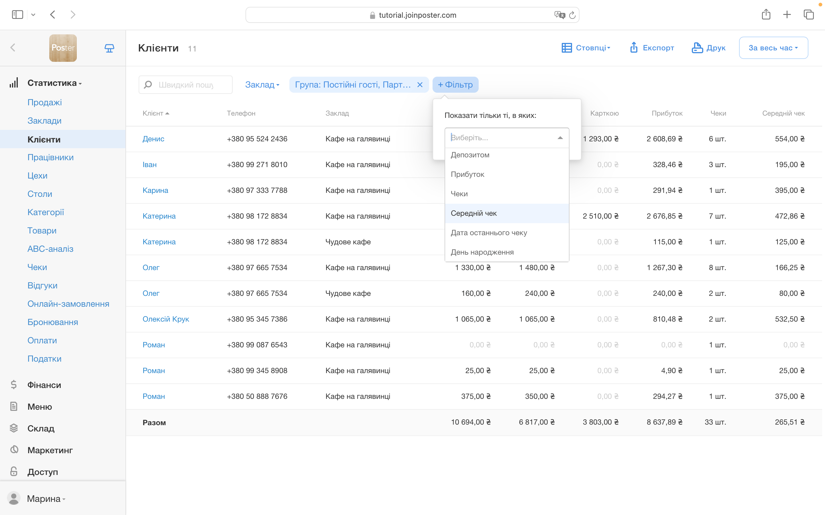 Дізнайтеся, які у клієнта улюблені страви, який середній чек, подивіться контакти, всі замовлення, знижки, бонуси та багато іншого. У вас буде повна інформація щодо кожного гостя.