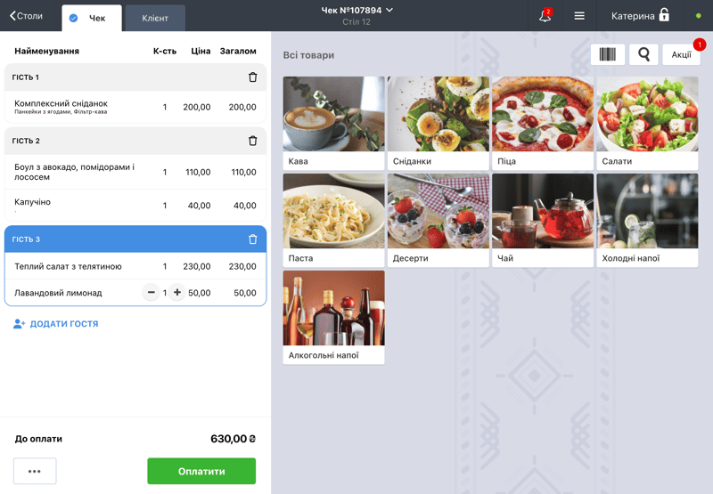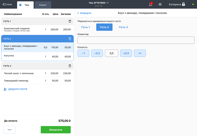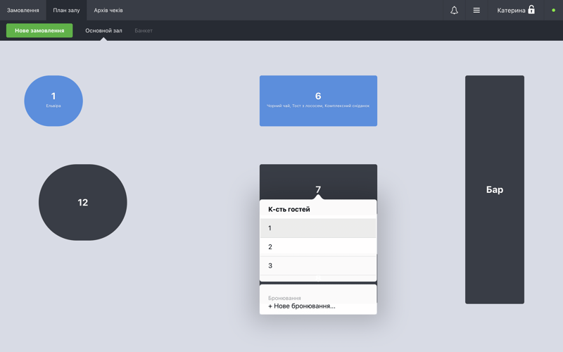 Поділіть чек між декількома гостями, змініть столик чи офіціанта просто в замовленні — це займе декілька секунд.